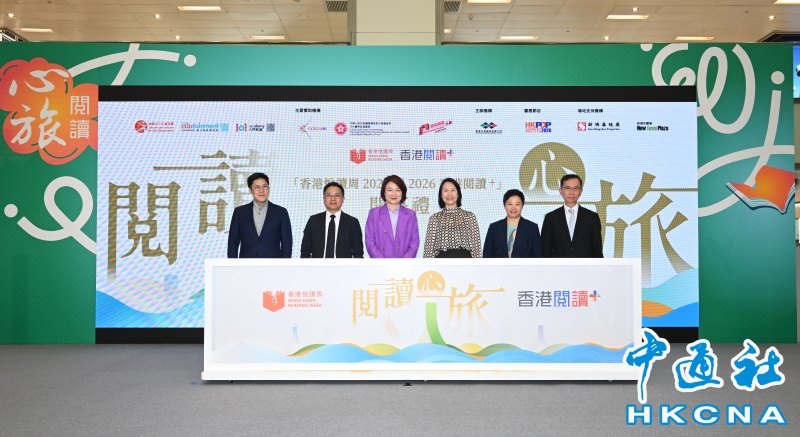 •   4月18日,香港康樂及文化事務署香港公共圖書館聯同香港出版總會在沙田新城市廣場舉行“香港悅讀周2026暨2026香港閱讀+”開幕禮。圖為主禮嘉賓(左起)立法會議員霍啟剛、深圳市委宣傳部副部長蘇榮才、立法會主席李慧琼博士、康文署署長陳詠雯、文創產業專員黎細明,以及立法會議員及香港出版總會會長李家駒博士。 香港中通社圖片