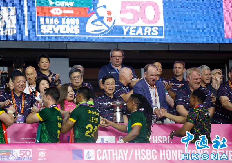 •   4月19日,香港國際七人欖球賽,男子組決賽南非隊(綠)以35:7擊敗阿根廷奪得冠軍。香港特區行政長官李家超為奪冠球員頒獎。(香港中通社記者 陳奕啟 攝) 香港中通社圖片