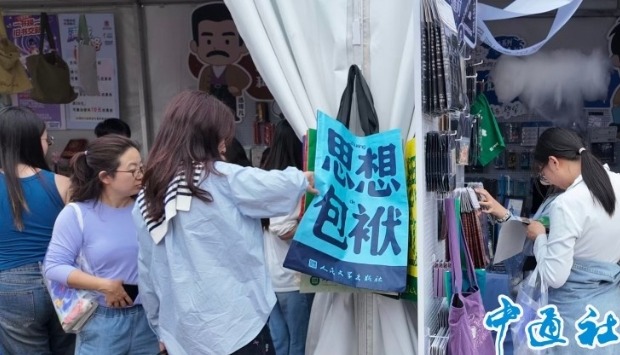 •     2026年4月25日,2026年春季北京書市期間,朝陽公園展區內人民文學出版社旗下的“朝花夕拾·文創咖啡供銷社”展位前,讀者們正在選購文創產品。 香港中通社圖片