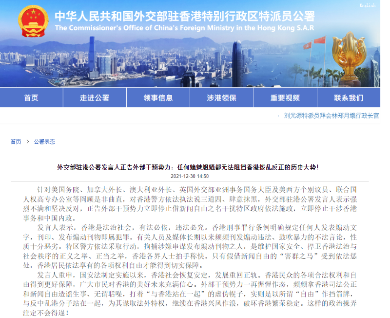 駐港公署:任何魑魅魍魎都無法阻擋香港撥亂反正的歷史大勢 香港中通社12月30日電 針對美國務院、加拿大外長、澳大利亞外長、英國外交部亞洲事務國務大臣及美西方個別議員、聯合國人權高專辦公室等罔顧是非曲直,對香港警方依法執法說三道四、肆意抹黑,外交部駐港公署發言人表示強烈不滿和堅決反對,正告外部干預勢力立即停止借新聞自由之名干擾特區政府依法施政,立即停止干涉香港事務和中國內政。