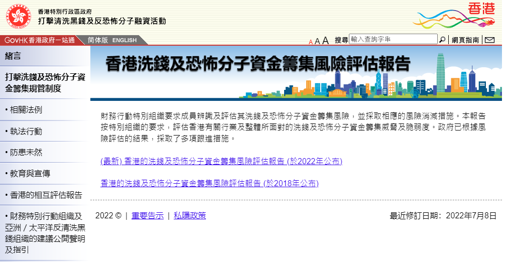 香港發佈洗錢及恐怖分子資金籌集風險評估報告香港中通社7月8日電 香港特區政府8日公佈最新香港洗錢及恐怖分子資金籌集風險評估報告,評估香港有關行業及其整體近年所面對的洗錢及恐怖分子資金籌集的威脅及脆弱度,並首次就香港所面對有關大規模毀滅武器擴散的資金籌集風險作出評估。 報告指出,香港具備穩健的法律架構、高度的政治承擔,而政府機構之間和公私營界別之間擁有緊密的夥伴關係,加上檢控和司法程序公平有效,以及與外地和國際社會合作良好,因此香港在打擊洗錢、恐怖分子資金籌集和大規模毀滅武器擴散資金籌集方面的能力獲評為高水平。
