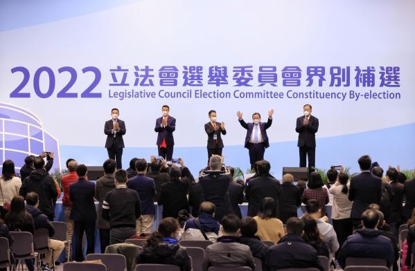 香港立法會選舉委員會(選委會)界別補選18日舉行,六名候選人角逐四個議席。 最終,黃錦輝(右一)、陳永光(右二)、何敬康(中)和尚海龍(左二)在當日的補選中當選。(香港中通社記者 曹文毓攝) 香港中通社圖片