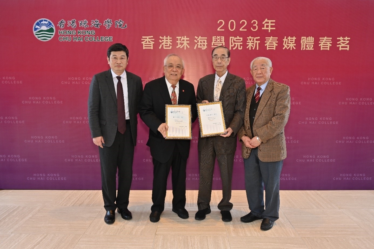林主席(右一)、陳校長(左一)頒發感謝狀予捐贈人,當中包括楊孫西博士(右二)與劉志仁先生(左二)。 珠海學院為香港歷史上最悠久的自資院校,2023年才正式更名為香港珠海學院。(完) 相關新聞