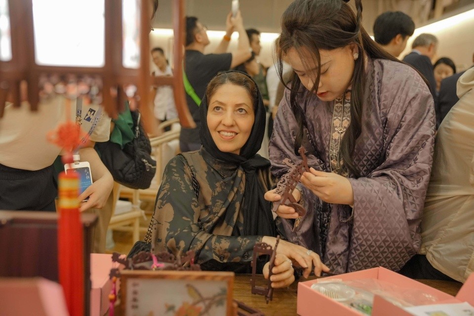活動尾聲,嘉賓移步至室內生活美學館,在悠揚的嶺南古琴伴奏聲中,品嘗中國傳統茶飲,親身體驗紅木宮燈製作。