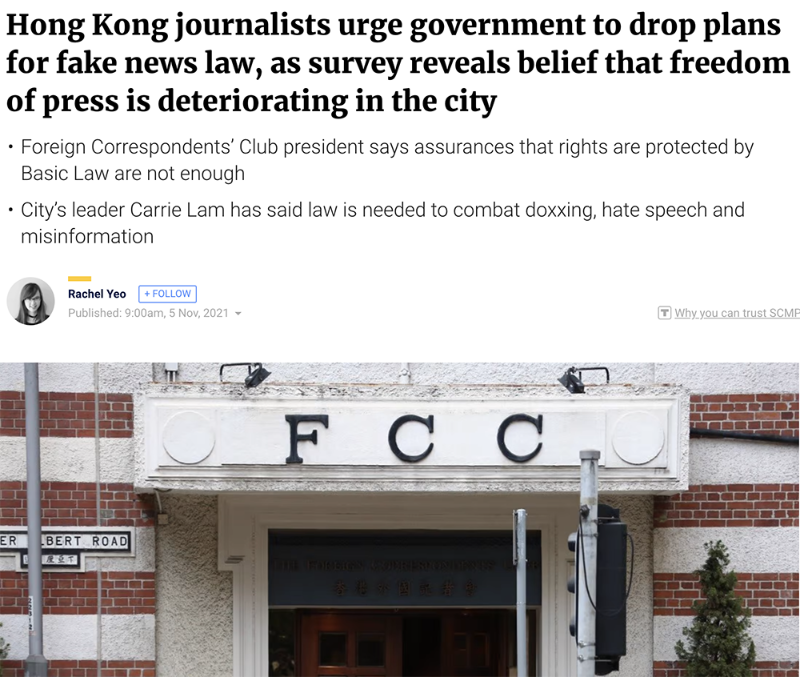 荒唐!香港外國記者會要港府放棄“假新聞法” 網友:怕不能造假在香港失業?香港新聞網11月5日電 香港特區政府近期正著手研究立法打擊假新聞,嚇壞一眾“黃記者”。在一個所謂的調查問卷中,近半受訪記者聲稱要離開香港,被指常抹黑香港新聞自由的香港外國記者會(FCC)因此要求港府放棄訂立“假新聞法”。有網友揶揄稱,“這是個外國假記者協會吧!” “不能造假,這些外國記者在香港都快失業了!” 據香港《南華早報》報道,香港外國記者會(FCC)發布一份調查問卷報告,聲稱逾9成受訪記者對“假新聞法”感到擔憂,促港府放棄立法。這份所謂關於香港新聞自由的調查問卷訪問了99名記者會員,84%受訪者聲稱香港國安法實施後工作環境“惡化”,46%受訪者稱正考慮或已經計劃好離開香港。