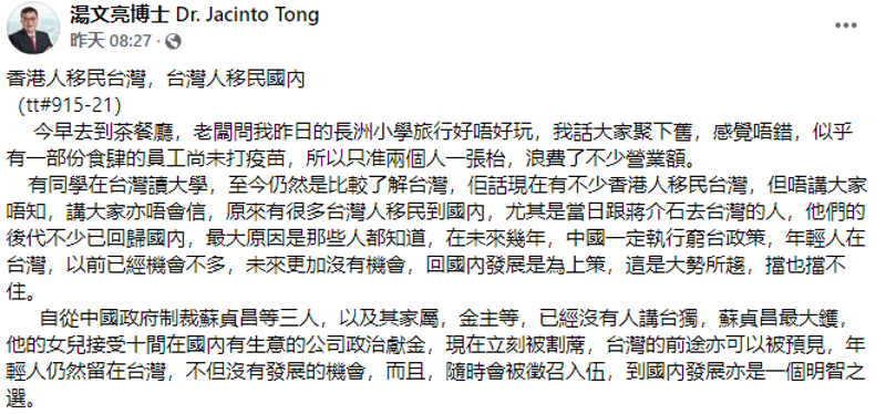 香港新聞網11月22日電 香港“黃媒”及島內綠媒沆瀣一氣,不遺余力地炒作“越來越多的港人移居台灣”,然而事實卻是...... 近日,香港紀惠集團行政總裁湯文亮博士在社交媒體發文稱,“有同學在台灣讀大學,至今仍然是比較了解台灣,他說現在有不少香港人移居台灣,但不講大家不知道,原來有很多台灣人移居到大陸。最大的原因是那些人知道,年輕人在台灣以前已經機會不多,未來更加沒有機會,回大陸發展是為上策,這是大勢所趨,擋也擋不住。”