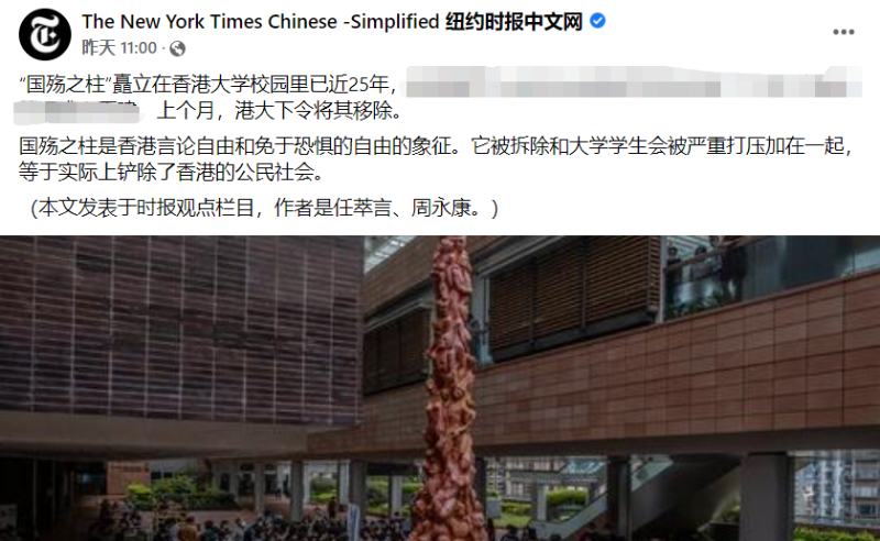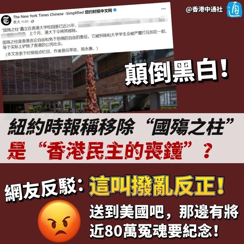 報道截圖 在文章中,他們還“夾帶私貨”地抹黑香港校園撥亂反正的一系列舉措,宣稱“香港的大學正在懲罰在校園內發表不同意見的學生”,這導致“許多學生幹部辭職,學生會陷入癱瘓……” 但事實是,香港部分大學的學生會已非正常的學生團體,而是成了公然進行違法活動、鼓動暴亂的激進政治組織。這些學生會不僅政治化、極端化,還曾招攬校外的暴徒進駐,令校園飽受摧殘。 直到香港國安法正式通過,香港各大學才回歸正軌,校園亦恢復往日的和平寧靜。 亂港分子在《紐約時報》上口口聲聲地說是香港校方“逼迫”學生組織解散,試問,若這些學生奉公守法、問心無愧,又何須“心虛”地在第一時間“潛逃”、辭職? 對於美媒聯合亂港分子抹黑香港的舉動,有網友隨即在評論區內反駁:“這叫撥亂反正!” 反中亂港勢力將辱華雕塑與“香港自由”劃等號的言論更是無稽之談!有網友就“建議”不如把該雕塑送到美國——“這條柱可以送到華盛頓,與華盛頓紀念碑並立,用以紀念被屠殺的印第安人。”