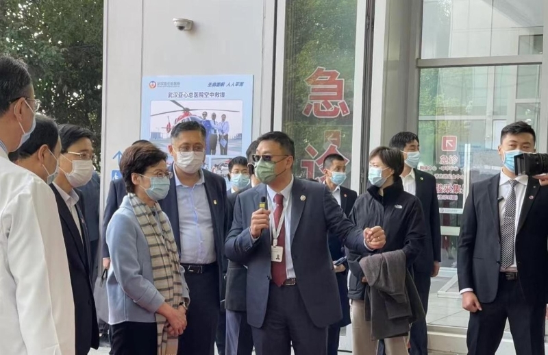 (圖源:長江日報) 林鄭月娥一行先後參觀了醫院空中救援高架直升機場以及醫院自購救援直升機“亞心一號”,新冠疫苗接種中心、備用新冠患者專用負壓病房,並與一線抗疫醫護人員交流。林鄭月娥還向前線抗疫醫護人員贈送錦旗,感謝他們在抗疫期間的艱苦奉獻。 林鄭月娥在致辭時表示,武漢醫護人員的付出,不只令內地人士和港人感動,亦展現國家在突如其來公共衞生危機中對世界有擔當,體現制度優勢。她認為,到目前都沒有一個國家和地區,包括香港,能做到內地的抗疫工作,希望透過與湖北省成立高層合作,總結抗疫經驗。她同時指出,本港實施嚴格隔離措施,由內地回港的50多萬人次都“零感染”。 林鄭月娥又說,希望本港經過兩年政治考驗,回到“一國兩制”正軌後,可以更好融入國家發展大局,又指港企日後不應只投資地產,亦要投資在醫療健康領域。林鄭月娥參觀期間,武漢亞心總醫院總經理謝兆基向她介紹醫院設備和疫情期間工作。港區全國政協委員、醫院董事長謝俊明,以及湖北省副省長趙海山亦在場。 林鄭月娥還會到武漢的智能車企業考察,下午拜會省領導,出席鄂港合作會議第一次會議,並發表講話和見證簽署合作備忘錄。 【編輯:王瑶】