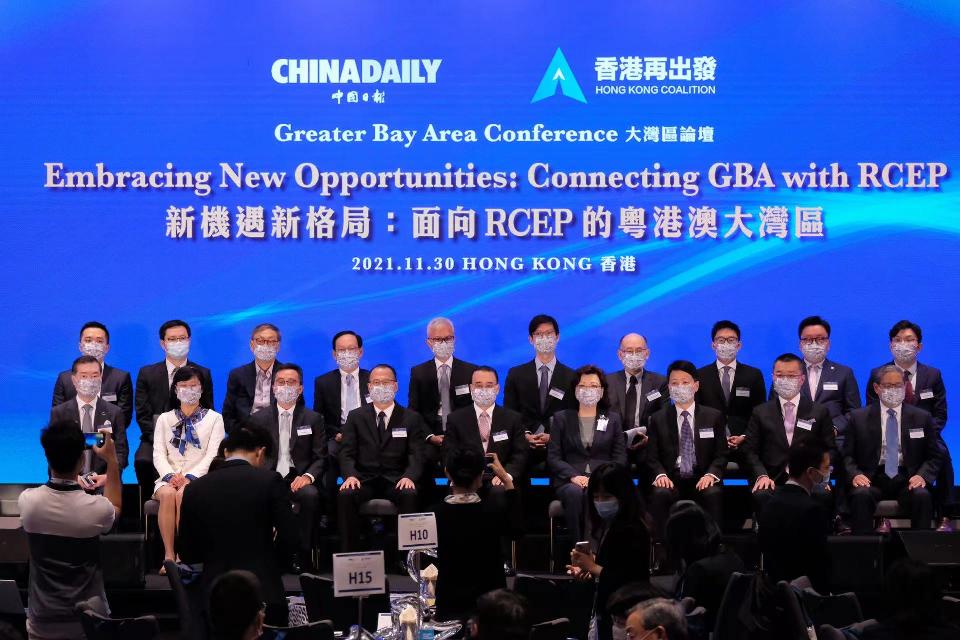 中國日報攜手香港再出發大聯盟合辦的“2021大灣區論壇”11月30日在香港舉行,此次論壇以“新機遇新格局:面向RCEP的粤港澳大灣區”為主題,全國政協副主席梁振英和中華人民共和國外交部駐香港特別行政區特派員公署特派員劉光源出席並作主旨演講,吸引逾400名政商學界人士以線上線下結合的方式参會。