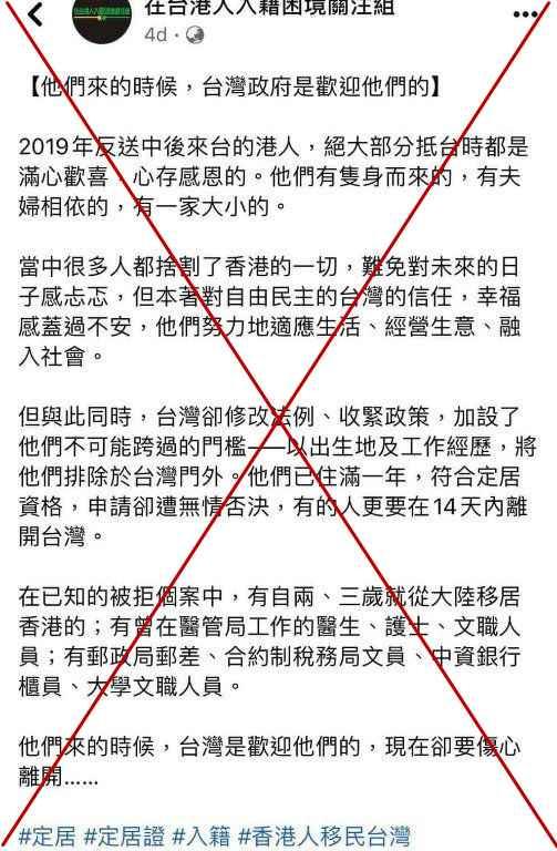 2019年香港“修例風波”發生後,台灣就不斷操弄“香港牌”,多次炒作稱“與香港人站在一起”、“關心香港民主自由”,還大張旗鼓推出所謂“香港人道援助關懷行政專案”及成立“台港服務交流辦公室”,為亂港分子提供庇護。 不少人對此信以為真,據“在台港人入籍困境關注組”在臉書專頁發布的內容,他們拋下在香港的一切,“滿心歡喜”、“心存感恩”去到台灣,“幸福感蓋過不安”,努力適應生活、經營生意、融入台灣社會。 結果呢?與此同時,台灣卻修改法例、收緊政策,加設了這幫人不可跨過的門檻——以出生地及工作經歷,將他們排除於台灣門外。 而當他們已住滿一年,符合定居資格時,申請卻遭無情否決,有人更要在14天內離開台灣。 貼文隨後列出一些被拒個案,並感嘆稱,“他們來的時候,台灣是歡迎他們的,現在卻要傷心離開……” 除了抱怨台灣民進黨翻臉不認人,該關注組還多次發文“澄清”,指近年傳媒報道經常以“暴升”、“創新高”、“破紀錄”等字眼形容來台港人數字,給外界一個印象,有龐大數字的香港人已移居台灣,台灣房價也因此被抬高。 但事實上,每年取得台灣定居資格的香港人僅千余人,此外也只是恰巧遇到台灣房價上升。