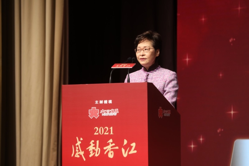 香港大公文匯傳媒集團今日 (9日) 舉辦“2021感動香江”頒獎典禮,頒發“2021感動香江”人物、團體、特別致敬等獎項。特首林鄭月娥發表致辭表示,此次活動充滿正能量,可以發掘香港好人、好事、好能量,給年輕一代帶來啟發。 林鄭表示,經過過去兩年多的社會動亂,疫情打擊,香港社會比過去更需要正能量。2019年是香港動亂暴力不安的一年,中央政府因此全面貫徹“一國兩制”方針,制定實施香港國安法,重新完善香港特區選舉制度,讓“一國兩制”重新回到正確的軌道上,確保香港繁榮穩定。新冠疫情雖然還沒有完全結束,但在政府和各界共同努力下,有效控制本地疫情,香港回復平穩安定,經濟也在疫情穩定下逐漸復甦。