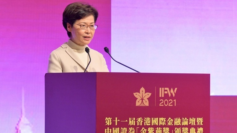 林鄭月娥:力推香港與內地資本市場互聯互通 放眼大灣區發展機遇“2021 第十一屆香港國際金融論壇暨中國證券 ‘金紫荊獎’”頒獎典禮今日(17日)舉行。林鄭月娥致辭時指出,在國家雙循環的新發展格局下,特區政府會積極推動香港與內地資本市場互聯互通,並放眼大灣區的發展機遇,通過區域性合作讓業界開拓內地市場。 該頒獎禮由香港大公文匯傳媒集團聯合北京上市公司協會、香港中國企業協會、香港中國金融協會、香港中資證券業協會、香港公司治理協會、香港證券學會共同舉辦。香港特區行政長官林鄭月娥、外交部駐港特派員公署副特派員潘雲東、財經事務及庫務局局長許正宇,全國政協常委吳良好等約 250 位嘉賓出席了活動。 林鄭月娥致辭表示,今年是“十四五”規劃開局之年,也是香港由亂轉治、由治及興的新起點。過去幾個月香港的社會政治環境穩定,疫情基本受控,多項經濟指標持續改善,顯示香港的經濟復甦勢頭良好。 她提到,截至今年11月底,已有45家公司納入了“滬港通”和“深港通”的合資格股票範圍。此外,粵港澳大灣區“跨境理財通”及債券通“南向通”這兩項業界熱切期待的措施也在今年9月先後在香港正式推出,在10月也有深圳首隻離岸人民幣地方政府債券在香港發行,並在港交所上市,進一步鞏固了香港的國際金融中心地位。