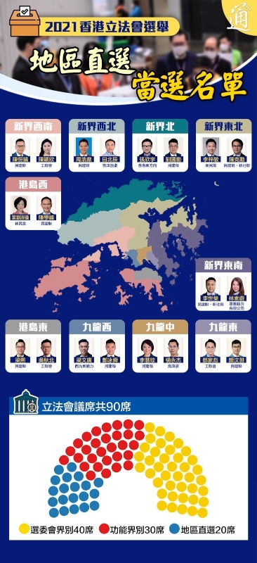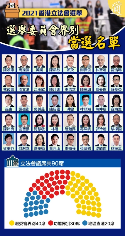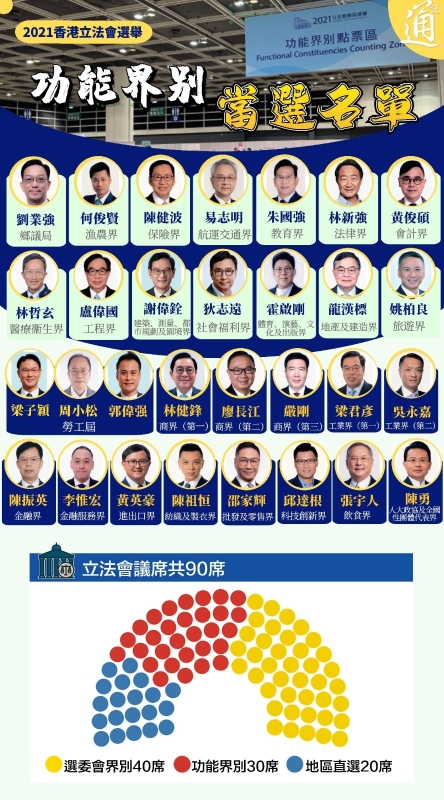 香港新聞網12月20日電 2021年立法會換屆選舉於12月19日舉行,這是香港特區完善選舉制度後舉行的首次立法會選舉。投票於19日上午8時半開始,至晚上10時半投票順利結束,三個界別的選民都踴躍投票。共有153名候選人競逐90個議席,全部90席都出現競爭,無人會自動當選,體現了選舉具廣泛代表性、政治包容性、均衡參與性及公平競爭性。 完善選舉制度後,立法會議席由70席增至90席,當中由選舉委員會選舉產生40名議員,由功能界別選舉產生30名議員,由地區直選選舉產生20名議員。新一屆立法會90名議員名單已於今日(20日)全部出爐。 特區政府今日公布,將於明年1月3日(星期一)上午11時在立法會綜合大樓會議廳舉行第七屆立法會議員的宣誓儀式,並由行政長官林鄭月娥為議員監誓。戳圖看清90人當選名單!