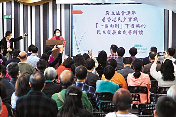譚惠珠昨日於九龍社團聯會“從立法會選舉看香港民主實踐《“一國兩制”下香港的民主發展》白皮書解讀”專題講座上演講。 香港文匯報記者 攝 九龍社團聯會昨日舉辦“從立法會選舉看香港民主實踐 《“一國兩制”下香港的民主發展》白皮書解讀”專題講座,有數百人出席。譚惠珠在講座上回顧了香港回歸前後的民主發展。她表示,香港在英國殖民統治下沒有民主可言,英國屢次禁止在香港進行民主改革,直到殖民統治末期才急推“政制改革”,其實是別有用心。 她說,香港回歸祖國後才開啟了香港民主的新紀元,中國的國體政體決定了香港回歸後必然實行民主。中央政府堅定維護在香港特區發展民主的既定立場,而憲法和基本法亦全面構建了香港特區的民主制度。 譚惠珠指,白皮書旨在說明英國殖民時期香港沒民主,香港的民主發展是由中國政府其後一直推動,直至全國人大常委會2014年作出“8·31”決定,確定香港可以從2017年開始,行政長官選舉可以實行由普選產生的辦法,但被否決。白皮書亦說明香港未來發展不會排除普選,現時只是修改基本法附件一、二,惟基本法第四十五條和第六十八條普選立法會議員和特首的目標不變。 盼解深層問題 抓灣區機遇 新選制下的立法會選舉順利產生了90位議員,譚惠珠說,香港已經“唔見咗24年”,未來4年,90位立法會議員將會很辛苦,大家要盡力解決香港深層次問題,令人信服這次選制的完善是成功的,同時亦要為香港全面發展打好基礎,以抓住國家特別是大灣區發展機遇,共同實現中華民族偉大復興。