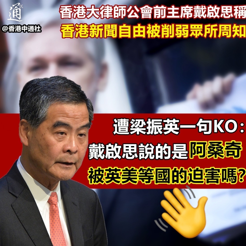香港新聞網12月29日電 香港前特首梁振英今日(29日)在社交媒體發文指出,《立場新聞》報道,今年香港記者協會周年晚宴的主禮嘉賓是大律師公會前主席戴啟思,“他致辭時指新聞自由被削弱眾所周知,但鼓勵在場記者,只要人們仍想知道甚麼是重要、想判斷真偽,新聞專業必會持續下去,記者的職責是讓謊言無所循形”。 梁振英揶揄:戴啟思說的是阿桑奇被英美等西方國家的迫害嗎?