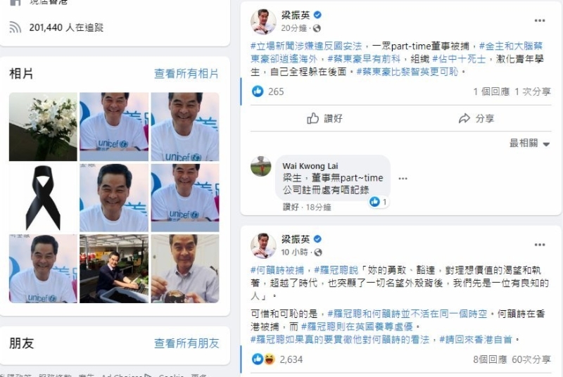 梁振英指出,《立場新聞》涉嫌違反國安法,一眾前董事被捕,但金主和大腦蔡東豪卻逍遙海外。他續指,蔡東豪早有前科,組織非法“佔中”,激化青年學生,自己全程躲在後面。他批評,蔡東豪比黎智英更可恥。 梁振英日前晚上亦發文指,何韻詩被捕,羅冠聰只是讚揚“妳的勇敢、豁達、執著”,可惜和可恥的是,羅冠聰和何韻詩並不活在同一個時空。何韻詩在香港被捕,而羅冠聰則在英國養尊處優。羅冠聰如果真的要貫徹他對何韻詩的看法,請回來香港自首。(完) 【編輯:崔靜雯】