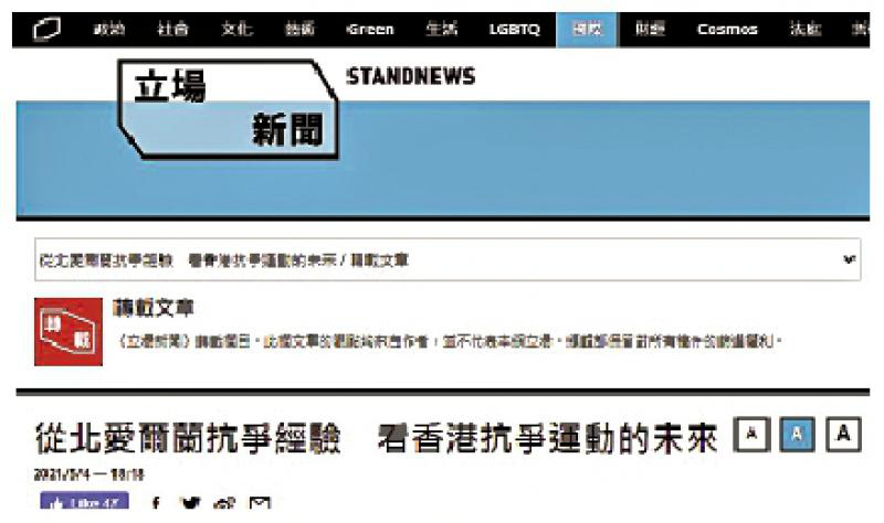 2021年5月,《立場新聞》又轉載一篇題為“從愛爾蘭抗爭經驗,看香港抗爭運動的未來”的文章。 譬如,2021年1月,《立場新聞》曾轉載題為“香港抗爭當務之急:與跨國移民公益組織結盟”的文章。 該文揚言“香港抗爭的‘國際線’要是能聯繫各樣的社運組織,與之建立合作”,以“對抗中共的力量”。 2021年5月,《立場新聞》又轉載一篇題為“從愛爾蘭抗爭經驗,看香港抗爭運動的未來”的文章。 該文則將北愛爾蘭武裝分子與所謂的“香港抗爭”進行比較,並得出結論稱:“北愛武裝反抗的土壤和環境並非絕無可能出現在香港”,“香港人有條件亦有必要背水一戰”云云。 這些文章隨即引發了香港社會各界的強烈不滿,不少人質疑其是公然觸犯《香港國安法》。最終,《立場新聞》悻悻然刪文了事。 2021年6月24日香港《蘋果日報》停刊,《立場新聞》企圖通過下架文章和辭職走人等舉動以求自保。但其偏頗報導仍未停止。 2021年11月11日,《立場新聞》發佈一篇題為“畢業生憶徒步前行護校哀山城人文精神消逝”的報導。 文中,作者多次以“守護中文大學”來形容2019年11月12日晚進入中大人士的目的,又以“警方對準校園射逾2000枚催淚彈”、“防暴警攻入校園”等偏頗字眼來描述警方的執法。 真正的事實,香港警方其實已經講過多次。當時是有暴徒在中大二號橋向吐露港高速公路及鐵路投擲雜物,不僅癱瘓交通,也嚴重危害駕駛者及公眾的安全,因此警方才要介入清場,結果遭到暴徒激烈抵抗。 根據《刑事罪行條例》第9條,“煽動意圖”包括意圖引起對香港政府和香港司法的憎恨、意圖煽惑他人使用暴力、意圖慫使他人不守法。 第10條定明,任何人作出或與任何人串謀作出煽動意圖的作為;或發表煽動文字、刊印、發佈、出售、要約出售、分發、展示或複製煽動刊物;或輸入煽動刊物,即屬犯罪,首次定罪可被判囚兩年及罰款5000元,其後定罪可處監禁3年! 至於《立場新聞》一案,最終結局如何,我們拭目以待。 【編輯:许丰悦】