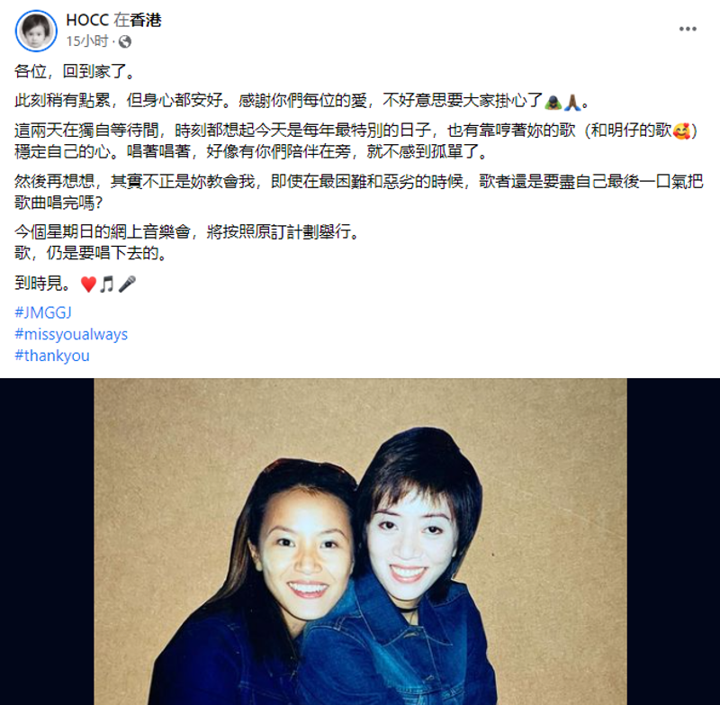 (圖源:頭條日報) 昨日是梅艶芳逝世18周年的日子。何韵詩獲保釋後,於社交平台上載其與梅艶芳的合照,寫稱“這兩天在獨自等待間,時刻都想起今天是每年最特別的日子,也有靠哼著你的歌(和明仔的歌)穩定自己的心。唱著唱著,好像有你們陪伴在旁,就不感到孤單了。然後再想想,其實不正是你教會我,即使在最困難和惡劣的時候,歌者還是要盡自己最後一口氣把歌曲唱完嗎?” 她又預告自己的網上音樂會將按原計劃於明年1月2日舉行。帖文末尾,她打上“miss you always”的標籤,將梅艶芳“擺上台”。