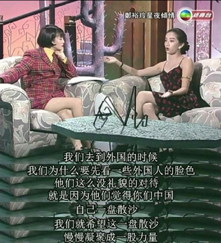 眾所周知,梅艶芳赤誠愛國。網上曾流傳一段視頻,據指是1992年9月,梅艶芳接受香港藝人鄭裕玲采訪的片段。在訪問中,梅艶芳動情地說,“我覺得現在中國在向一個好的方向發展,我們(香港)應該在背後支持。我們是中國人,想要中國好,但如果我們自己內部都亂糟糟的,外國人更加不會尊重我們,我們要凝聚起來,將來中國每個地方都會發揚光大。” 當時香港還未回歸祖國懷抱,鄭裕玲遂問梅艶芳“1997年會在哪裡?”對此,梅艶芳堅定地說,“我會在香港”。