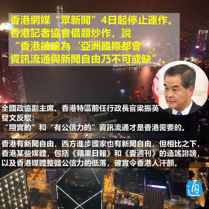 香港新聞網1月4日電 繼香港網媒“立場新聞”於上月29日宣佈停止運作後,創立5年的香港網媒“眾新聞”也於今天(4日)起停止運作。 香港記者協會借題炒作,說“香港被喻為‘亞洲國際都會’,信息流通與新聞自由乃不可或缺”。 全國政協副主席、香港特區前行政長官梁振英發文反駁道:“翔實的”和“有公信力的”信息流通才是“亞洲國際都會”需要的。