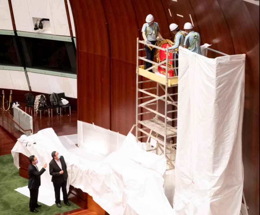 香港新聞網1月6日電 香港立法會行政管理委員會早前決定,在立法會會議廳同時懸掛國徽及區徽,預料有關工程將於下周三(12日)召開首次大會前完成。香港立法會主席梁君彥今(6日)早與立法會秘書長視察會議廳懸掛國徽及區徽的工程進度,強調有了國徽,會議廳將更莊嚴。