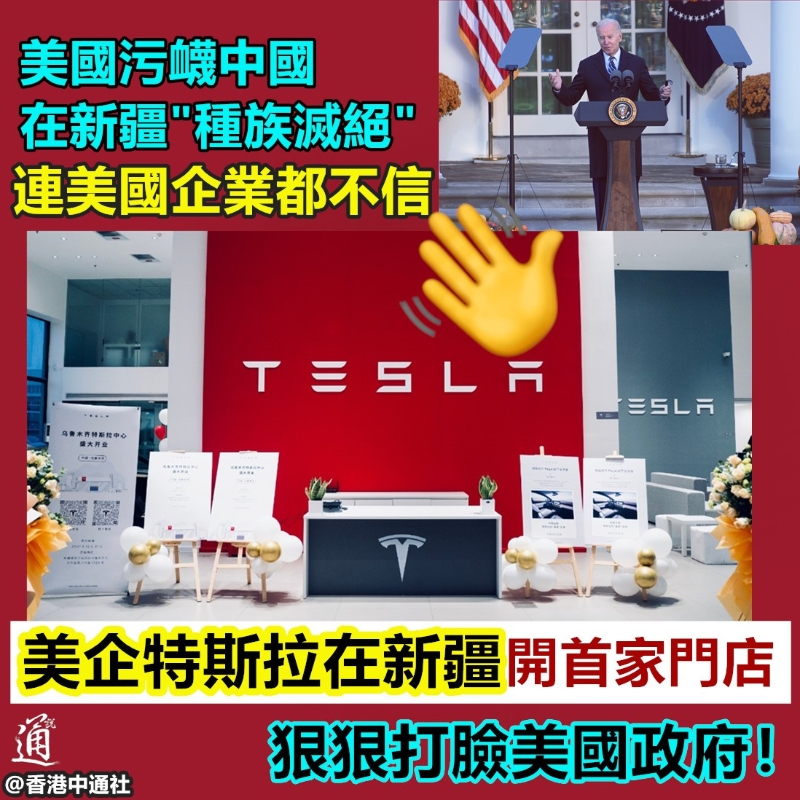 梁振英:如果有“種族滅絕”,特斯拉會在新疆開門店?香港新聞網1月7日電 美國一心造謠新疆,結果被自家企業打臉!香港前特首梁振英也忍不住了,發文揶揄美國政府…… 12月,美國總統拜登才簽署所謂“法案”,聲稱要“全面禁止進口來自新疆的商品”,卻遭美國車企特斯拉“對著幹”。同月特斯拉在中國社交媒體微博公布,位於新疆烏魯木齊的展銷中心開幕,並發布圖片。 從照片可見,有人在活動現場手持標語,展示“Tesla(特斯拉)愛新疆”的字句。