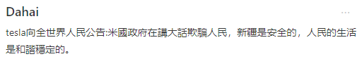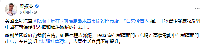 梁振英鞭辟入裡的發言,引來眾多香港網友點贊叫好! 在有關消息的留言區內,香港網友紛紛表示,“特斯拉向全世界人民公告:美國政府在講謊話欺騙人民,新疆是安全的,人民的生活是和諧穩定的”,“若新疆門市業績好,證明當地人有自由、有購買力,美國政府的臉都被要打歪了!” “中國對少數民族的政策比世界任何國家都好,哪來的種族滅絕?”有網友不滿中國少數民族政策一再被扭曲抹黑,直斥西方殖民者“種族滅絕的惡行才歷歷在目!” 特斯拉在新疆開門店的舉動讓反華政客苦心編造的涉疆謊言“不攻自破”。一時間他們顔面無光,紛紛跳出來對特斯拉“口誅筆伐”。 美國反華政客、所謂“維吾爾強迫勞動預防法案”的主要推動者盧比奧在社交媒體上“氣急敗壞”地說,特斯拉“幫中國掩蓋在新疆實施的種族滅絕和強迫勞動”。美國白宮發言人普薩基也出言威脅,稱特斯拉或“面臨嚴重的法律、聲譽和客戶風險”。 眼見美國政府鉚足勁造謠新疆,結果反“誤傷”自家企業……香港網友忍不住挖苦道,“美國要不要抵制特斯拉?”“‘民主’社會也阻止人做生意?” “不明白白宮的邏輯!”還有網友為美方“出謀劃策”,指應該“讓特斯拉開遍新疆,搜集你們至今拿不出的‘種族滅絕’的證據啊!