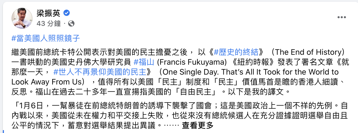 香港新聞網1月12日電 美國斯坦福大學研究員福山 (Francis Fukuyama) 近日在《紐約時報》發表文章《就那麼一天,世人不再景仰美國的民主》(One Single Day. That’s All It Took for the World to Look Away From Us),全國政協副主席、香港前特首梁振英今日(12日)在社交媒體發文表示,這篇文章值得所有以美國“民主”制度和“民主”價值馬首是瞻的香港人細讀、反思。而正是這位福山在過去二十多年一直致力宣揚美國的“自由民主”。