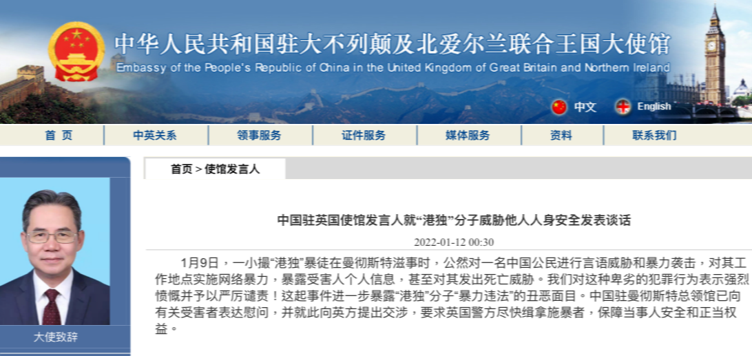 使館發言人表示,當地時間1月9日,一小撮“港獨”暴徒在英國曼徹斯特滋事時,公然對一名中國公民進行言語威脅和暴力襲擊,對其工作地點實施網絡暴力,暴露受害人個人信息,甚至對其發出死亡威脅,對這種卑劣的犯罪行為表示強烈憤慨並予以嚴厲譴責。 發言人強調,這起事件進一步暴露“港獨”分子“暴力違法”的醜惡面目。中國駐曼徹斯特總領館已向有關受害者表達慰問,並就此向英方提出交涉,要求英國警方盡快緝拿施暴者,保障當事人安全和正當權益。 【編輯:张琦】