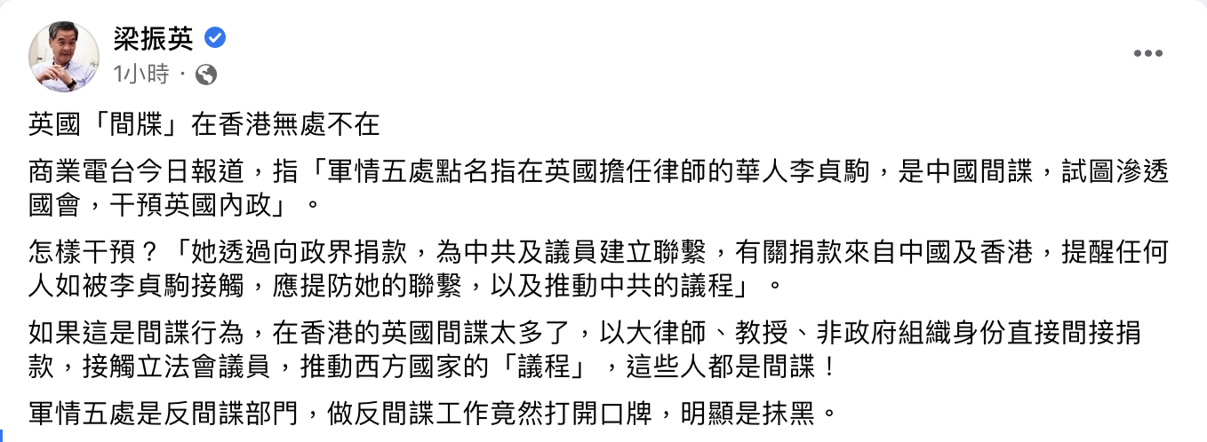 香港新聞網1月14日電 香港商業電台今日(14日)報道稱,“軍情五處點名指在英國擔任律師的華人李貞駒,是中國間諜,試圖滲透國會,干預英國內政”。對此,全國政協副主席、香港前特首梁振英在社交媒體發文指出,英國“間牒”在香港無處不在。