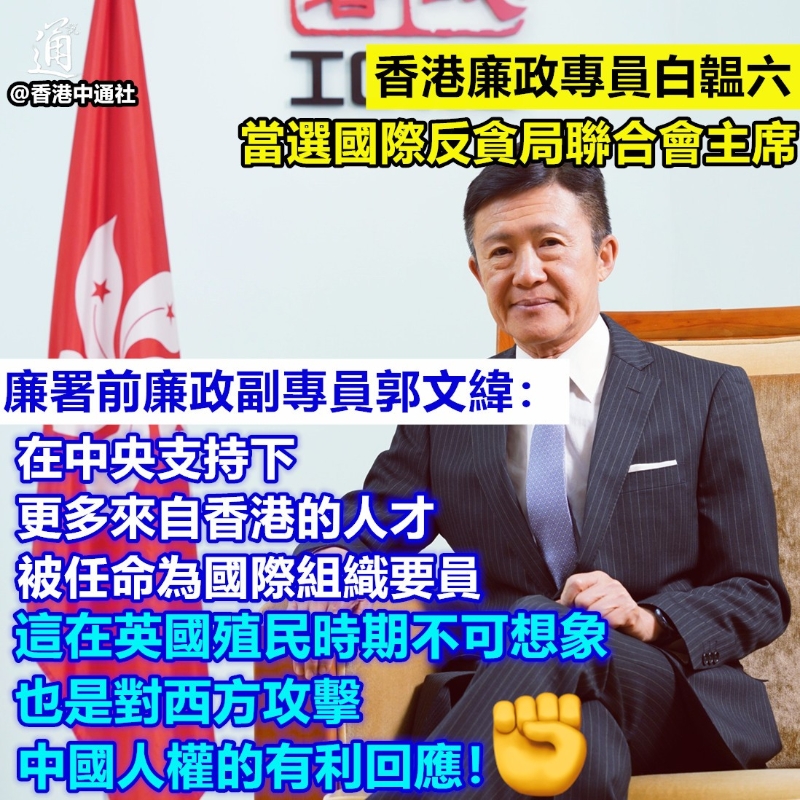 香港新聞網1月17日電 香港廉政專員白韞六當選國際反貪局聯合會主席後,前廉政副專員感歎:這在英國殖民時期不可想象,也是對西方攻擊中國人權的有力回應! 香港廉政公署前廉政副專員郭文緯近日在《南華早報》發文稱,香港廉政專員白韞六1月5日於國際反貪局聯合會舉行的會員大會上當選新一任主席。這個好消息來得正是時候。過去一年來,香港一直因所謂的人權問題遭到西方不公平的妖魔化。然而,在這個由140多個國家和地區代表組成的國際機構看來,選擇香港特區廉政公署的負責人領導全球反貪戰鬥,實屬情理之中。如果香港不是一個擁有人權的公平社會,白韞六就不會當選。這是對(西方)惡毒攻擊的最有力回應。 作為一名擔任令人矚目的國際角色的香港市民,白韞六正追隨從2007年至2017年擔任世衛組織總幹事的陳馮富珍女士的腳步。毫無疑問,在中央政府支持下,來自香港的更多人才也將被任命為國際組織要員——這在英國殖民時期是不可想象的。