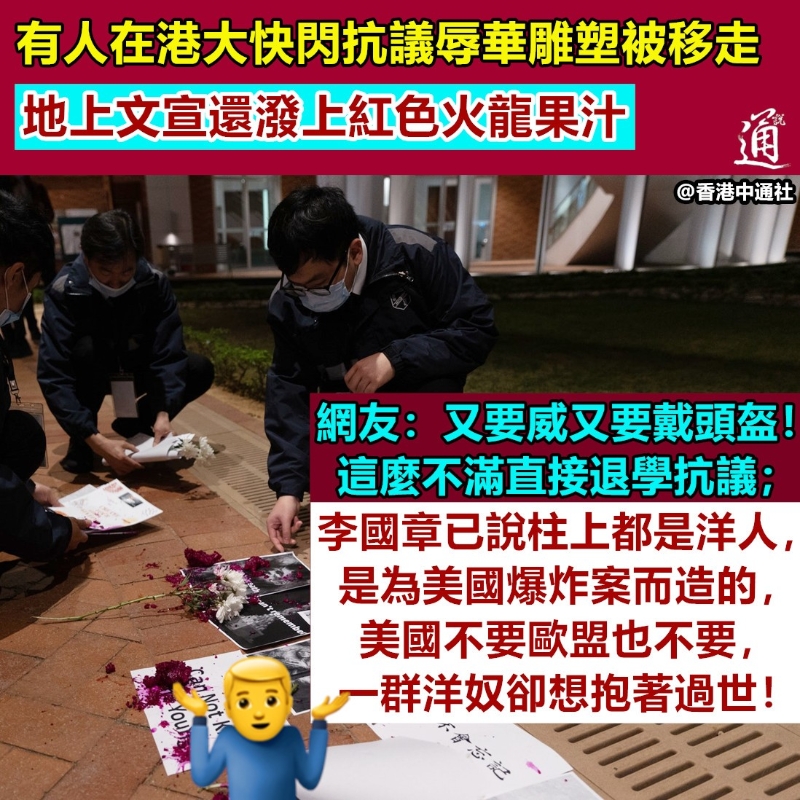 不滿辱華雕塑被移走,有人在港大搞“快閃抗議”,還潑火龍果汁?分享到: