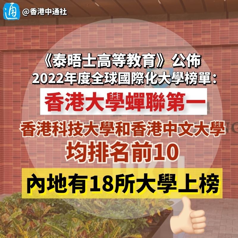 香港新聞網1月20日電 在《泰晤士高等教育》最新公布的2022年度全球國際化大學榜單中,香港大學再度奪魁。 據悉,《泰晤士高等教育》2022年度全球國際化大學榜單,由世界大學系列排名數據中,全球各大學在國際學生、國際職員、國際合著和國際聲譽指標上的得分編製而成。香港大學、香港科技大學和香港中文大學上榜,並且均排名前10;內地有18所大學上榜,由北京大學和浙江大學領銜。 《泰晤士高等教育》表示,研究表明,多元化的學生群體可以改善教學和學習體驗。學生如果有機會在國外生活和學習一段時間,將更加有利於培養他們成為全球公民。上榜的院校都有很高的國際學生和員工比例,與來自世界各地的學者合作開展研究,並擁有與之相匹配的,強大的全球聲譽。