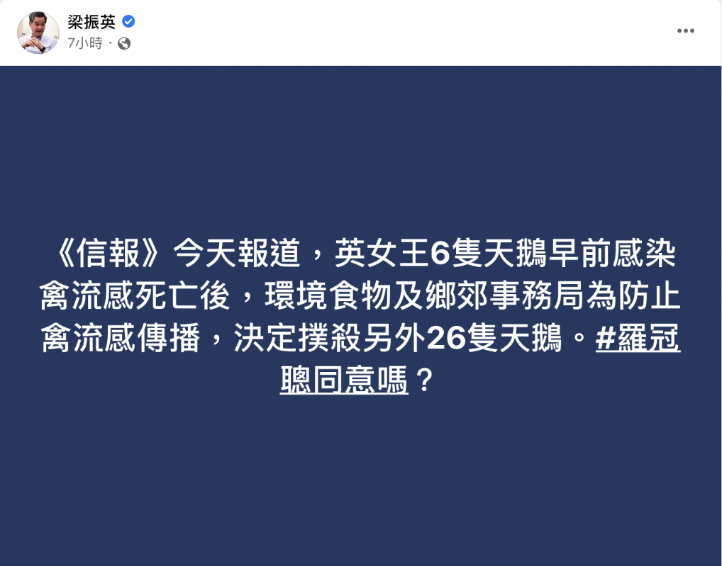 網絡截圖 日前銅鑼灣一寵物店懷疑出現“鼠傳人”個案,為審慎起見,香港漁護署對全港約二千隻倉鼠和小動物實施人道處理。羅冠聰亦不忘在貼文中蹭熱點,聲稱倉鼠“因為高官的投誠而賠上性命。” 對於羅冠聰的連番謬論,香港前特首梁振英今天(20日)在社交媒體發文質問羅冠聰。 他引述《信報》報道稱,英女王6隻天鵝早前感染禽流感死亡後,英國環境食物及鄉郊事務局為防止禽流感傳播,決定撲殺另外26隻天鵝。對此,羅冠聰同意嗎?
