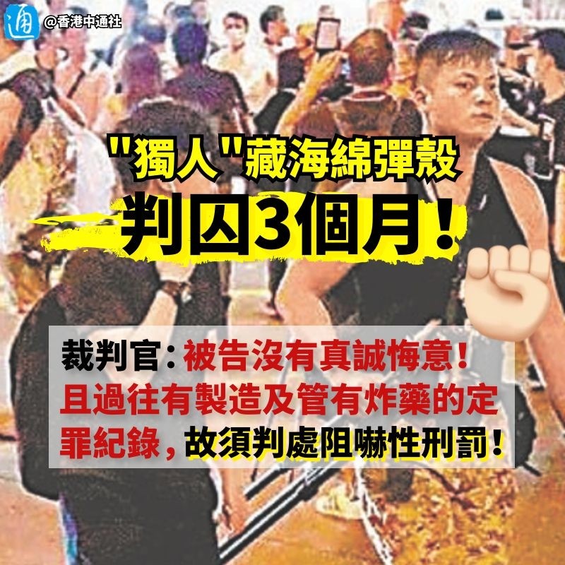 香港新聞網1月2日電 有爆炸品案前科的“獨人”鄭偉成,在“修例風波”期間變身網媒“記者”,活躍於黑暴肆虐前線。2019年8月初,他在觀塘警署附近被警員搜出兩枚已使用過的海綿彈,被控一項無牌管有彈藥罪,早前經審訊後被裁定罪成,昨在觀塘裁判法院被判監3個月。裁判官鍾明新判刑時指,被告在審訊後被定罪,沒有真誠悔意,加上被告過往有製造及管有炸藥的定罪紀錄,故須判處阻嚇性刑罰。 被告鄭偉成(35歲)過去有兩次案底,分別於2015年“光復元朗”反水貨客示威期間,因攜有辣椒油噴劑,在公眾地方管有攻擊性武器而被判監6個月,以及牽涉同年西貢蠔涌爆炸品案,因串謀製造炸藥及管有炸藥被判監兩年10個月。本案發生時他已服刑完畢。 案情透露,警員截查被告期間,從他褲袋內搜出涉案海綿彈殼,當時被告身穿記者背心,他在警誡下稱無參與非法集結。審訊期間,被告於庭上辯稱打算把海綿彈“交還警方”,惟不獲鍾官接納。