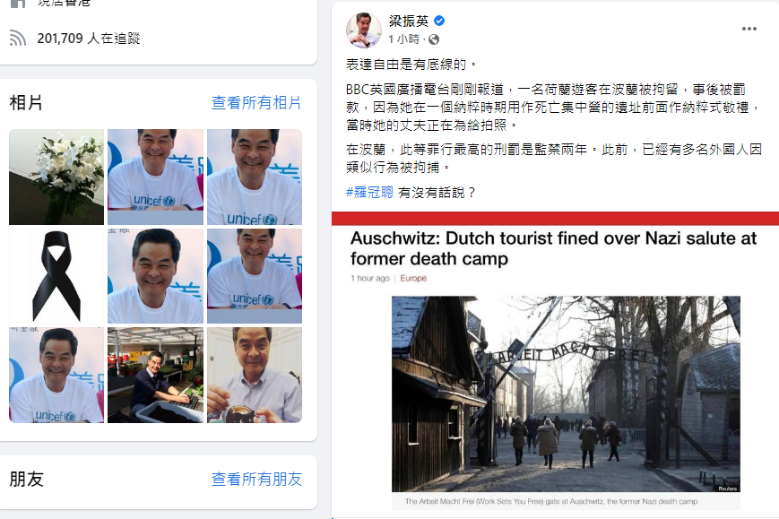 梁振英引述BBC英國廣播電台報道指出,一名荷蘭遊客在波蘭被拘留,事後被罰款,因為她在一個納粹時期用作死亡集中營的遺址前面作納粹式敬禮,當時她的丈夫正在給她拍照。