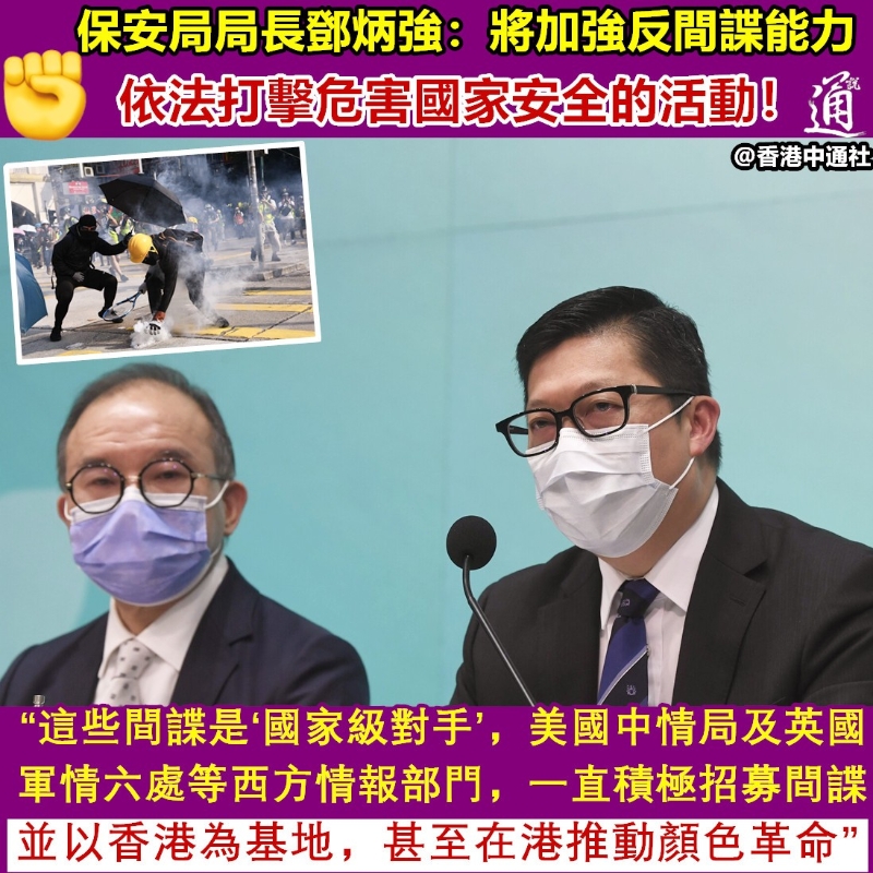 香港新聞網1月27日電 香港保安局局長鄧炳強26日出席立法會質詢環節時,被問到如何應對大量外國間諜在香港的活動。他表示,有關工作會與《基本法》23條立法一併處理,將加強反間諜能力,依法打擊危害國家安全的活動。 據《星島日報》報道,鄧炳強表示,特區政府一直依法打擊發生在香港的危害國家安全活動,包括間諜活動,尤其是從事間諜活動的人及其幕後代理人。他形容,這些間諜是“國家級對手”,美國中情局及英國軍情六處等西方情報部門,一直積極招募間諜人員,並以香港為基地,甚至在香港推動“顏色革命”。