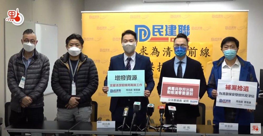 香港新聞網1月29日電 據大公文匯全媒體報道,民建聯今日(29日)舉行“要求為清潔前線提供抗疫津貼”記招,要求為前線清潔及保安人員提供額外津貼,每月至少1000元,為期7個月。立法會議員周浩鼎表示,第五輪防疫抗疫基金並無涵蓋前線清潔保安,但Omicron病毒傳染力較高,加上疫情擴散,前線清潔人員承受較大的感染風險,不少人因而辭職,令清潔工的工作量大增,應該獲得額外津貼。