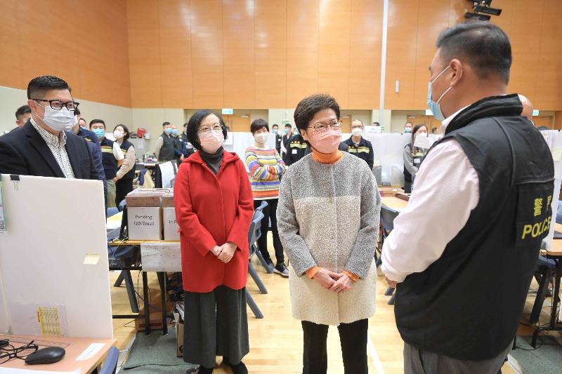 圖示林鄭月娥(右二)在啟德個案追蹤辦公室與警務處人員交談。旁為食物及衞生局局長陳肇始教授(左二)及保安局局長鄧炳強(左一)。 林鄭月娥在食物及衞生局局長陳肇始、保安局局長鄧炳強和衞生署署長林文健陪同下,先後前往衞生署早於去年1月設於啟德的追蹤辦,以及新設於旺角、今年1月下旬投入運作的追蹤辦。懲教署署長胡英明和海關關長何珮珊亦有到旺角的追蹤辦,一同為各同事打氣,送上新年祝福。 她說,面對傳播力極強的奧密克戎(Omicron)新冠變種病毒,特區政府致力採取“快、準、狠”的措施盡快遏止第五波疫情。除了追蹤每宗確診個案的密切接觸者及迅速將其隔離外,並要求密切接觸者的密切接觸者按風險程度接受強制檢測或強制檢疫,是特區政府與變異病毒株進行時間競賽以遏制疫情的重要一環。 啟德和旺角的追蹤辦分別於去年和今年1月啟用,合共有約400人,大部分來自紀律部隊,至今協助追蹤超過3.1萬名接觸者。(完) 【編輯:丘志彬】