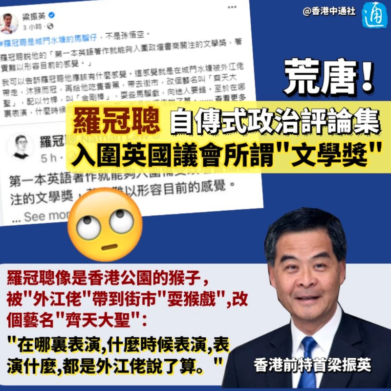 香港新聞網2月4日電 流竄英國的前香港眾志主席羅冠聰,去年底出版首本英文自傳式政治評論集,近日竟入圍英國議會所謂的文學獎(Parliamentary Book Awards)。 對此,全國政協副主席、前特首梁振英昨日(3日)在網上發帖,嘲諷羅冠聰是“城門水塘的猴子”,被“外江佬”帶到街市“耍猴戲”,改個藝名“齊天大聖”:“哪裏表演,什麼時候表演,表演什麼,都是外江佬說了算。”他諷刺羅冠聰“不僅可以拿書商的文學獎,將來還可以拿諾貝爾文學獎。”