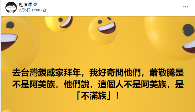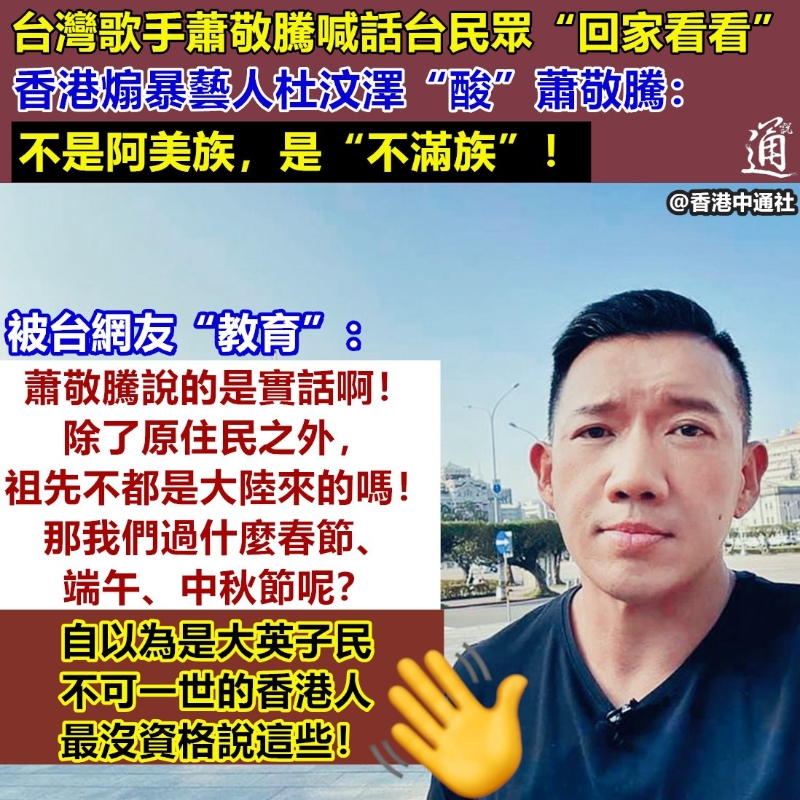 香港新聞網2月7日電 對台灣歌手妄加指責的香港煽暴藝人杜汶澤,被島內網友狠狠“教育”了! 1月31日,台灣歌手蕭敬騰登上央視春晚的舞台,與藝人陳坤、王嘉爾等合唱歌曲《黃河 長江》。此前,他接受央視新聞采訪時說,“相信有很多在台灣的朋友,都很想念自己的家鄉”,希望大家聽到這首歌後一定要“回家看看”。 這句彰顯兩岸一家親、台灣人就是中國人的言論傳回島內後,讓綠營的玻璃心碎了一地! 5日,移居台灣的香港煽暴藝人杜汶澤亦發帖“蹭”蕭敬騰的熱度,狂刷存在感! 杜汶澤在社交媒體上寫道,“去台灣親戚家拜年,我好奇問他們,蕭敬騰是不是阿美族,他們說,這個人不是阿美族(注:蕭敬騰母親是阿美族人),是‘不滿族’!”