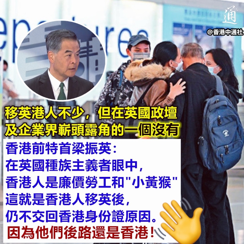 香港新聞網2月8日電 香港前特首梁振英在社交媒體以《不少香港人要“移民”英國》為題發文稱,香港人移民英國,歷史久遠,但和印度人、非洲人不一樣,香港人雖然移英人數不少,但在英國政壇、企業界和學術界嶄頭露角的就一個都沒有...... "對這問題,所謂移民去英國的香港人心中有數,”梁振英指出,港人移民“去英國,充其量就是搵兩餐,做廉價勞工(cheap labour),在英國種族主義者眼中,是yellow monkeys (小黃猴),不僅這代人如此,下一代也是如此。” 他揶揄,這就是“香港人所謂移民去英國之後,仍然堅持不交回香港身份證的原因”,因為他們的後路還是香港。