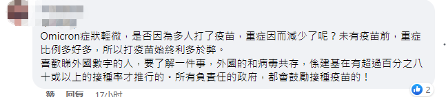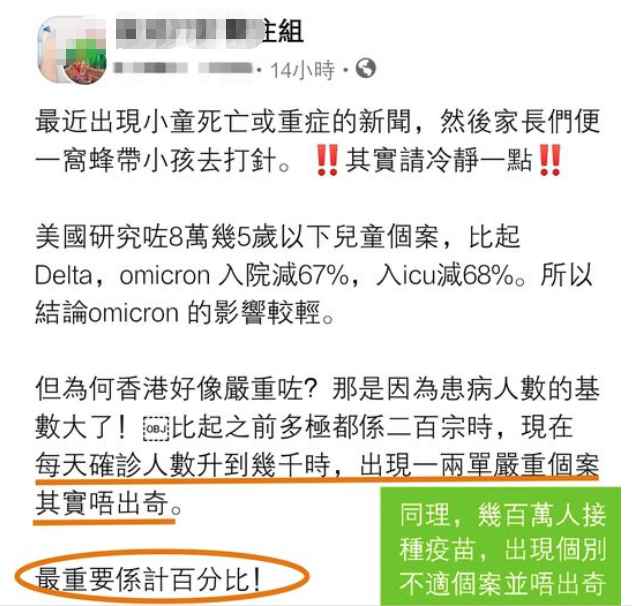 (網絡截圖) 日前,有“黃絲”在所謂“關注組”臉書專頁發帖,引用美國研究數據稱,奧密克戎感染個案症狀較輕,在香港之所以變得嚴重,是因為患病人數的基數迅速增長。 他更對近期幼童重症或死亡發表冷血言論,聲稱“現在每日確診個案升至幾千,出現一兩宗嚴重個案其實不出奇”,要帶小孩打針的家長“冷靜一點”。 此外,還有“黃絲”為抹黑疫苗,竟然說出“疫苗內含有害物質,令細胞壞死”的窒息言論,試圖以此勸阻母親不要再接種疫苗。