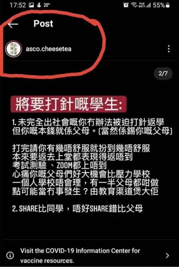 (網絡截圖) 在Instagram平台,也有人在煽抵制打針,目標群體是學生。 根據網友分享的圖片,有“黃絲”教唆學生,接種疫苗後要假裝不舒服,不僅去不了學校,連考試測驗、上網課也做不到,這樣父母就會施壓學校。 對此,香港網友紛紛怒斥“黃絲”漠視人命,“愈多人感染病毒,就愈多人會出現重症或死亡”、“他們當然不想家長帶小朋友去打針,因為死的不是他們的孩子。這就跟黑暴期間‘叫學生衝、自己松’一樣,犯法又不是他們”。 還有香港網友表示,奧密克戎病症輕微,是因為接種疫苗人群多了,未有疫苗之前,重症比例多好多,所以打疫苗始終利多於弊。