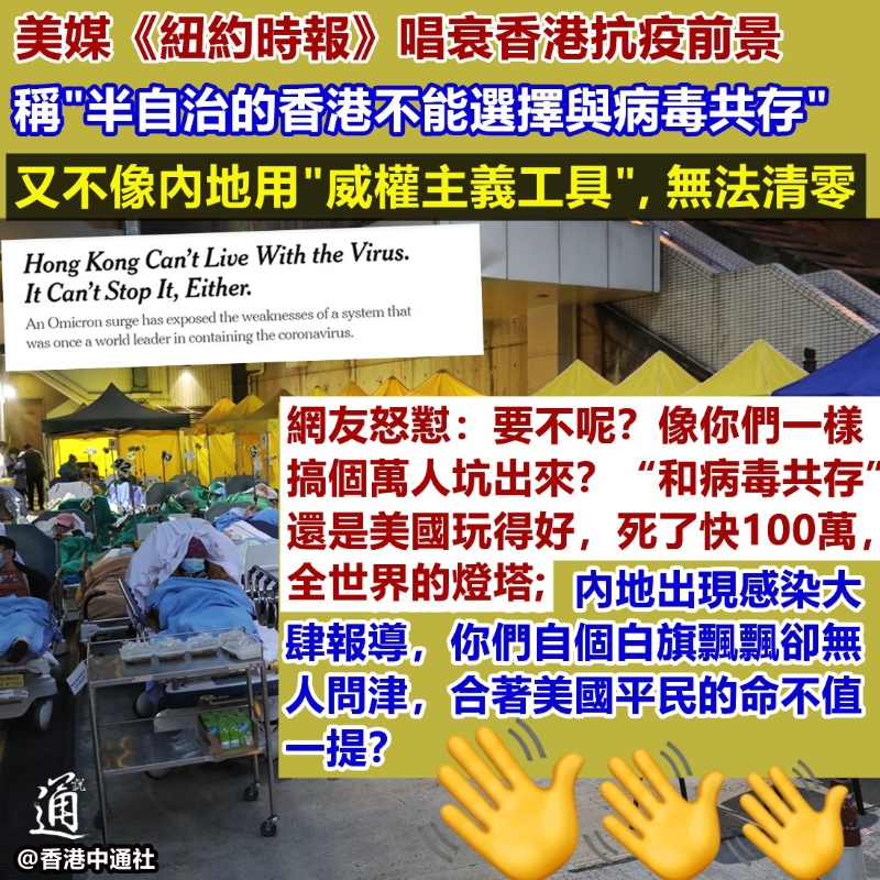 這篇“充滿政治偏見”的報道將內地行之有效的防疫手段粗暴地歸結為所謂的“威權主義工具”,宣稱正是因為香港無法照抄內地、使用“全套威權主義工具,或不惜一切代價動用似乎無限的人力,以阻止病毒傳播”,所以無法“清零”。 報道又以近期暴疫的廣西百色市的抗疫情況為例,稱百色“出現了數十例感染病例後,對全市進行了封閉管理,組織了3.8萬名黨員和工作人員前往社區協調物資供應。” “這種基層網絡一直是中國內地控制社會的方法之一。”美媒強行抹黑中國“生命至上”的理念,以及黨員等奔赴戰役第一線的行為,“陰陽怪氣”地強調“香港沒有這種網絡”、香港仍保留內地“未曾有過的某些自由”。暗示香港亦因此不會向內地其他城市一樣“清零”。 奧密克戎毒株來勢汹汹,為遏制疫情,有消息指,港府擬與內地商討,爭取在3月初替全港750萬市民逐步實施三次全民檢測,避免香港走入全面封城之困境。 美媒則借所謂“衛生專家”之口,宣揚在香港進行強制病毒檢測“不切實際”,還可能“激起已對港府深感不信任的市民的憤怒。” “一些人擔心,港府會以最近的疫情為由,推出更多的監控措施。”報道最後又玩起西方抹黑中國的老一套,透過香港中文大學一位教授之口,給港府可能實施的強硬抗疫政策潑臟水,試圖散播恐懼。 部分美媒慣常“戴著有色眼鏡”看中國,此次再發出一篇“無視科學、充滿政治偏見”的報道,引來不少中國網友怒懟! “要不呢?像你們一樣搞個萬人坑出來?”紐約時報中文網官方推特發佈此篇報道後,在評論區內,中國網友紛紛嘲諷美媒:“‘和病毒共存’還是美國玩得好,死了快100萬,全世界的燈塔”,“考30分的學渣對考95分的學霸說:‘你的成績很令人擔憂,你學習方法似乎出了問題,要借鑒我的學習方法,躺平’。”