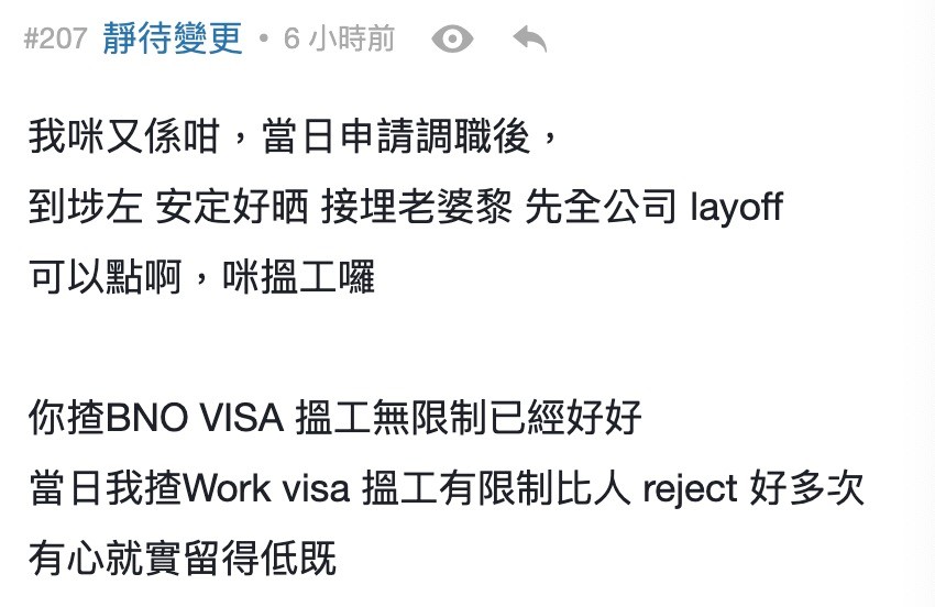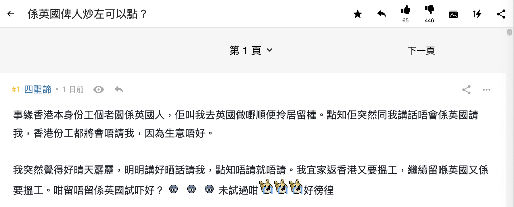 該“黃絲”頓覺晴天霹靂,抱怨稱,“明明說好要聘用自己,哪裡知道說炒就炒”。他坦言自己沒遭遇過這類事,感到好徬徨,現在兩邊的工作都沒著落,不知該回香港還是留英國。 該“黃絲”又說見到其他移英港人都需要三四個月才找到工作,估計自己想要找同等文職工作應該很難,直言“日子好難捱”。若留在英國做侍應,捱到有居留權後回香港,又不知道能找到什麼工作。 值得注意的是,該移英港人的情況並非特例。在連登討論區上,有移英港人就回覆稱,自己也是如此,當日申請調職後,抵達英國安定好一切,把老婆也接了過去,未料最後竟遭解僱。