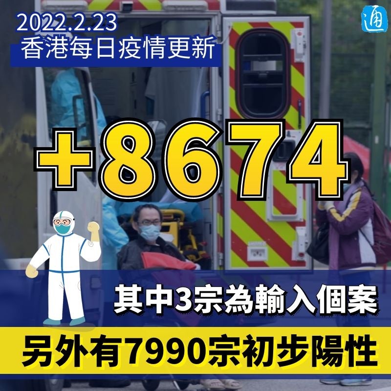 香港新聞網2月23日電 香港特區政府衛生署衛生防護中心23日通報,新增8674宗新冠確診,其中3宗為輸入個案,初步陽性7990宗。至今約1200名醫護人員染疫。