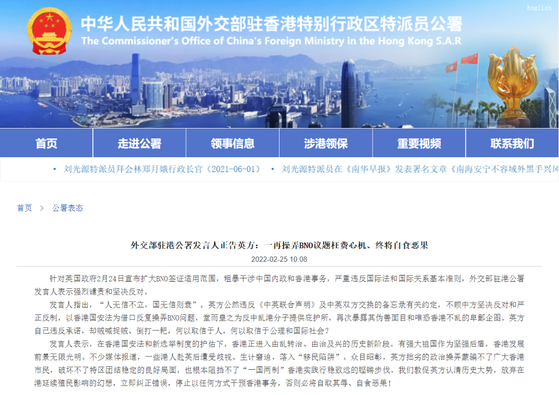香港新聞網2月25日電 針對英國政府2月24日宣佈擴大BNO簽證適用範圍,粗暴干涉中國內政和香港事務,嚴重違反國際法和國際關係基本準則,外交部駐港公署發言人今日(25日)發表聲明,表示強烈譴責和堅決反對。