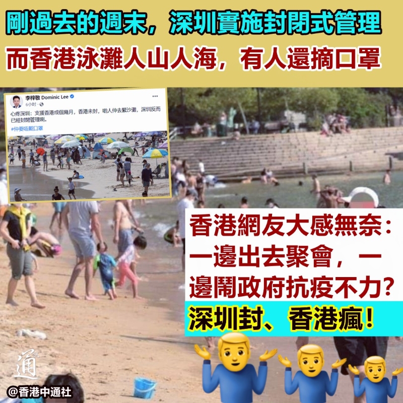 有關畫面於香港網絡流傳後,讓不少居家抗疫的香港市民大感無奈。 “這些香港人真是自私精,前線在打仗,還要抽人手救你?”在網絡評論區,有香港網友強調公營醫療系統已經超負荷,直斥有關行為“自私”。 “一邊出去聚會,一邊鬧政府抗疫不力!”也有網友諷刺這些人不配合港府的防疫政策,不僅給防疫帶來極大困難,亦傷害了其他乖乖守規矩的香港市民,讓別人的防疫努力化為泡影! 香港立法會議員李梓敬今日(14日)也在社交媒體曬出石澳沙灘“人山人海”的照片,并感嘆道:“心疼深圳:支援香港幾個月,香港未封(城),這些人還去沙灘,深圳反而已經封閉管理啦。”感嘆一河之隔的深圳在暴疫的情況下仍努力支援香港,可部分港人卻貪圖享樂,不斷給香港防疫施加困難及挑戰。 李梓敬還在帖文中提到,有些市民在沙灘游玩“還不戴口罩”! 與部分港人懶理防疫政策、輕視疫情形成鮮明對比的是,深圳市疫情防控指揮部13日發佈通告,在全市範圍內開展三輪全員核酸檢測。自3月14日至20日,除保障城市運行及供港物資貨運的交通外,全市公交、地鐵停運。 在深圳防控疫情的關鍵時期,仍在確保供港物資供應不受影響。 這給香港市民帶來不小的震動…… 香港知名導演高志森就在社交媒體發文,指出香港可以看下“別人(指深圳)”是如何“(做到防疫)快狠準”。 “深圳封、香港瘋!”對比港深的防疫表現後,亦有香港網友一針見血。