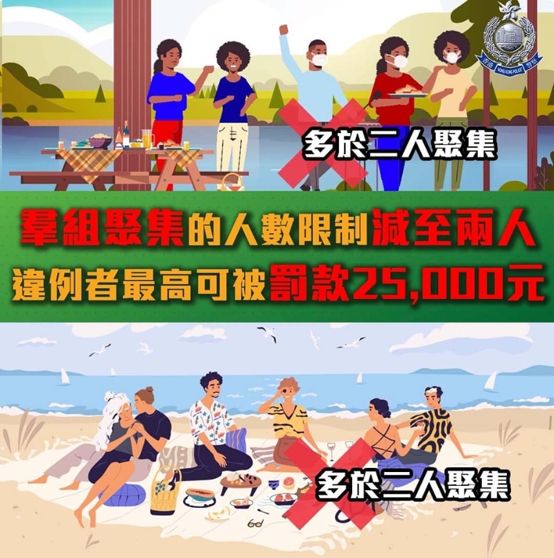 圖源:警方fb 警方提醒市民,政府早前已公告全面收緊一系列社交距離措施,包括在公眾地方群組聚集的人數限制由四人減至兩人。違者一經定罪,最高可被罰款25000元(港幣,下同)。 同時,警方表示,“於非室內地方進行體能活動(包括運動)”已不再屬於不佩戴口罩的合理辯解,即任何人在任何公眾地方(不論室內或室外),須一直佩戴口罩。任何人違反佩戴口罩的規例即屬犯罪,一經定罪最高可被罰款10000元。 鑑於疫情嚴峻,警方將會繼續聯同相關部門加強巡查,並會在不予警告的情況下,向違例人士進行執法行動。警方藉此呼籲市民切勿鬆懈,應繼續嚴格遵守預防及控制疾病的相關規例。 【編輯:李冉】